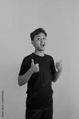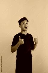 A young Asian man in a black shirt gives a thumbs up and smiles confidently against a dark yellow background. This image depicts positivity, approval, and satisfaction.