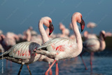African wild birds. A flock of pink flamingos on the blue lagoon against the bright sky