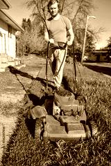 Man mowing a green lawn with a red lawn mower on a sunny day