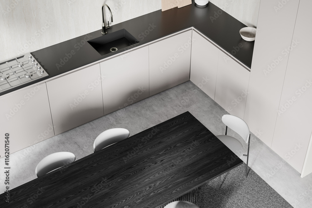 Modern kitchen interior with minimalistic furniture and dark wooden table. 3D Rendering