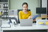 An Asian businesswoman sits at her desk in the office, working on her laptop, checking documents, and planning business strategies to enhance productivity and achieve professional goals