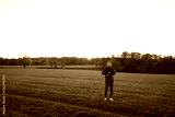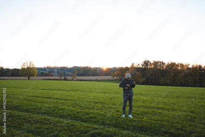 Musician in a plaid shirt and beanie plays the ukulele in a green field at sunset. The serene rural scene beautifully combines music, nature, and tranquility