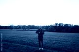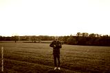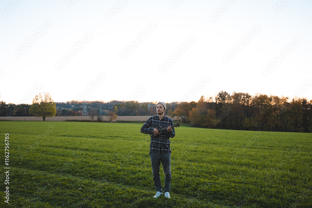Musician in a plaid shirt and beanie plays the ukulele in a green field at sunset. The serene rural scene beautifully combines music, nature, and tranquility