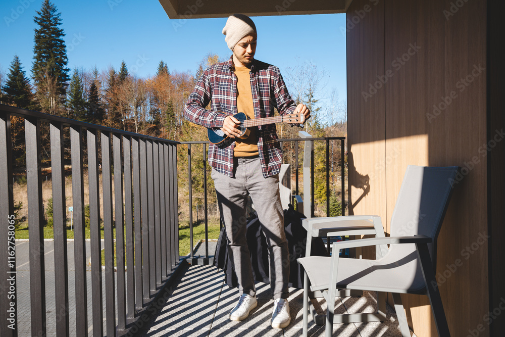 young musician stands on a sunlit balcony, playing the ukulele while gazing into the distance. Surrounded by autumn trees and fresh air, he enjoys a peaceful moment of creativity and self-expression