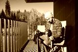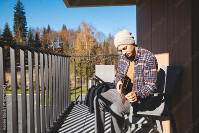 Young musician sits on a sunny balcony, immersed in playing the ukulele. Surrounded by autumn trees, he enjoys the peaceful moment outdoors, lost in his thoughts and music