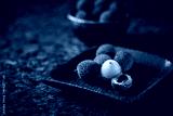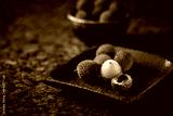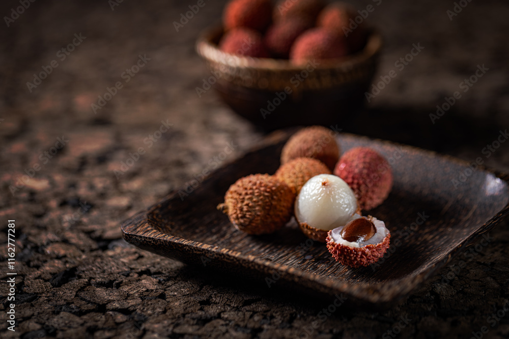 Fresh lychees are served on a wooden tray