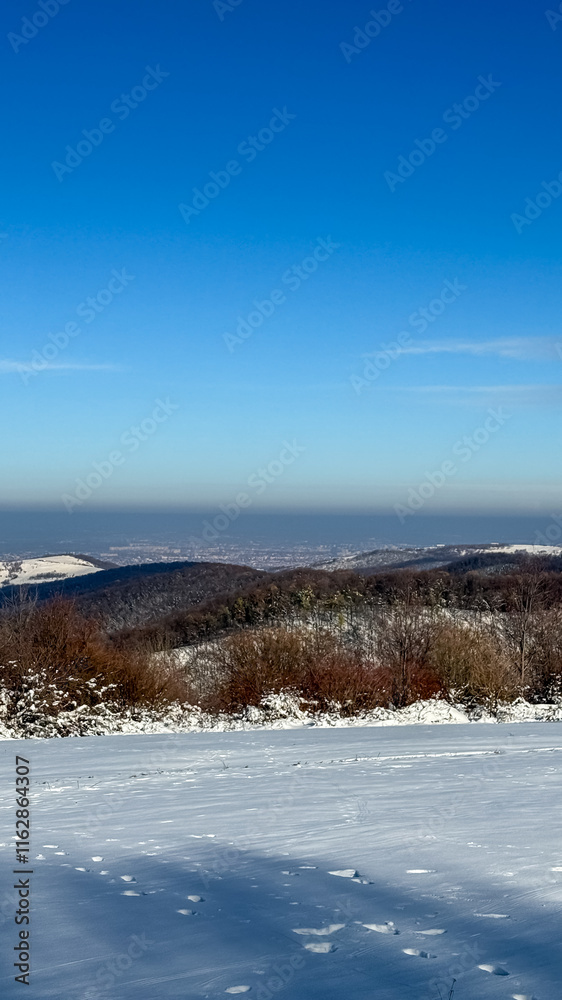 Scenic winter landscape with snowy hills and distant city view, representing tranquility and seasonal beauty, ideal for Christmas-themed content