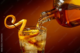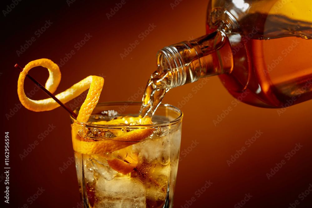 Old-fashioned cocktail classic bourbon whiskey and bitters, garnished with orange peel.