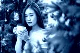 Portrait beautiful asian woman holding of positive the having cup of coffee,milk or chocolate at home in the living room indoors Decoration During Christmas x-mas and New Year holidays.