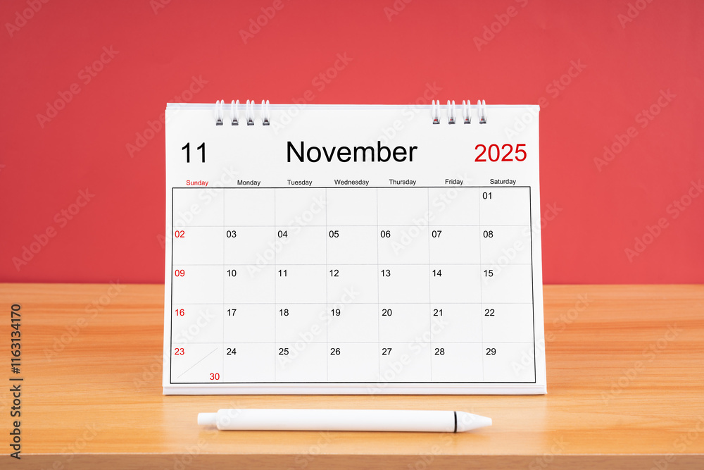 November monthly desk calendar for 2025 year and pen on the wooden table.