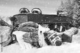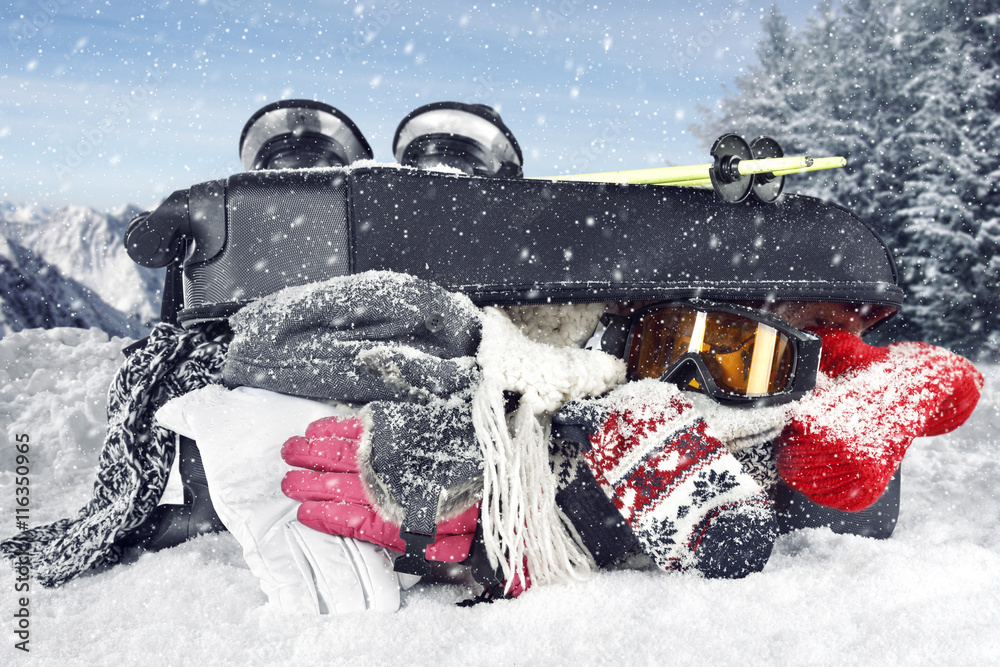 Winter clothing and ski accessories stuffed and spilling out of a large suitcase placed on a snowy slope, concept of travel, winter holidays, and skiing sports.