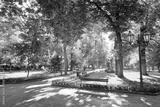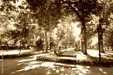 morning in city park, bright sunlight and shadows, summer season, beautiful landscape