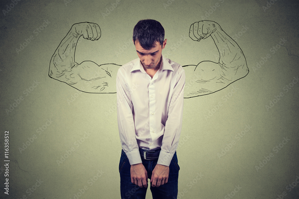 powerful guy reality vs ambition wishful thinking concept. Sad man looking down