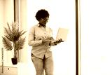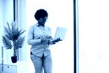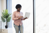 African American woman standing near window using laptop wearing casual attire in bright modern office. Young professional working in relaxed environment, incorporating technology and natural light.