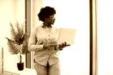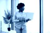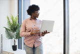 African American businesswoman in casual attire using laptop in bright modern office setting. Concept of professional work, technology use, and productivity.