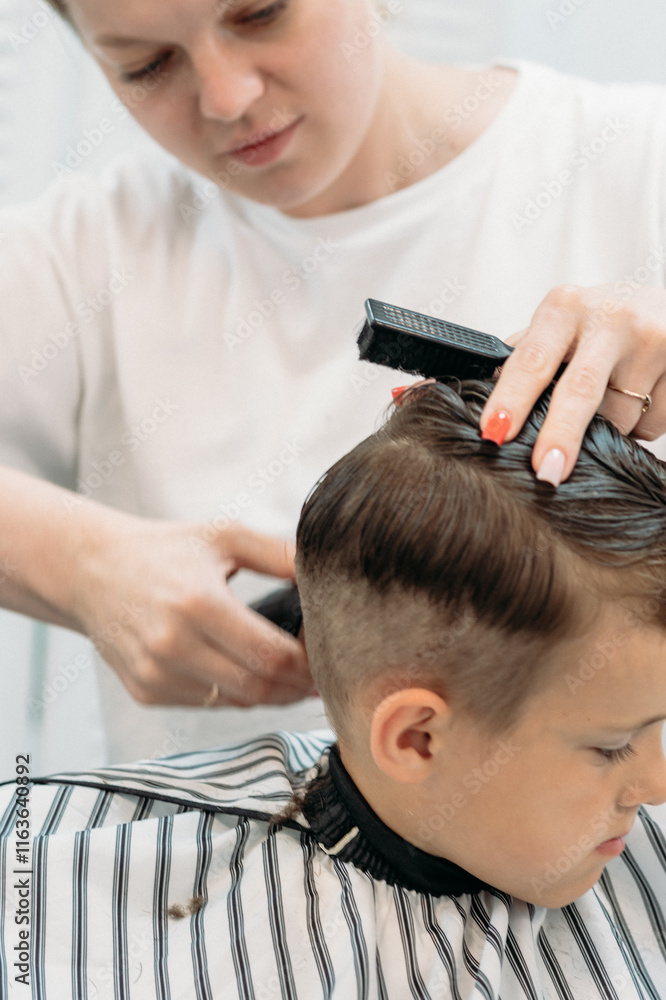A female hairdresser cuts a little boy's hair with a hair trimmer.