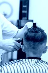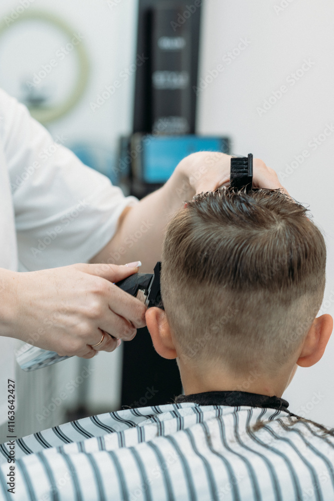 A little cute boy sits in a hairdresser's at the stylist's.
