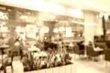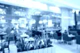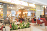 Big city mall in bokeh. Fashion and office center. Blurred image of light shop interior. Sale and market. Clean and luxury scene.
