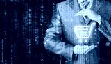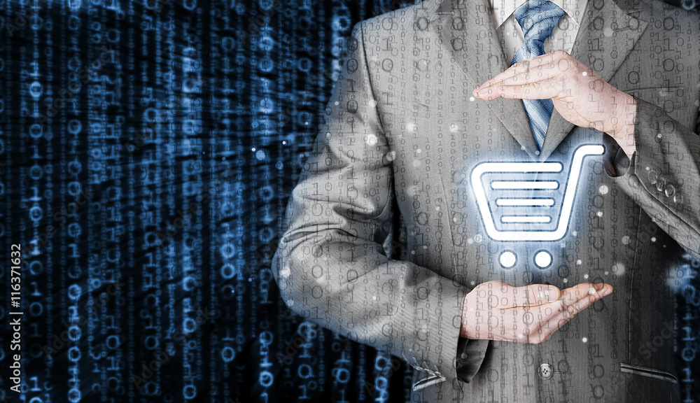 Consumer protection concept. Safety and insurance of trade and goods. Online marketing. Matrix background. Safe internet shopping. Attack and virus free. Safe credit card.