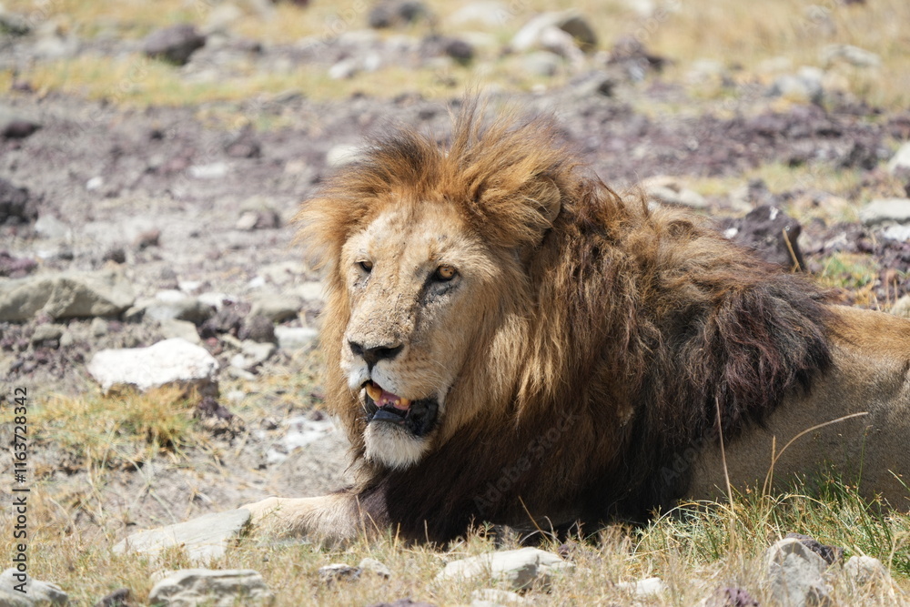 close up of a male lion laying down in the Ngorongoro crater Tanzania, older male, mane,