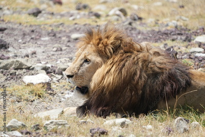 close up of a male lion laying down in the Ngorongoro crater Tanzania, older male, mane,