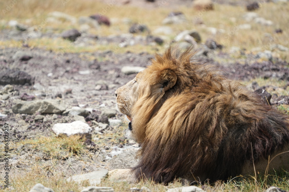 close up of a male lion laying down in the Ngorongoro crater Tanzania, older male, mane,