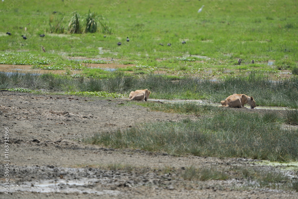 lioness (lions) drinking from a small water pool in the serengeti national park