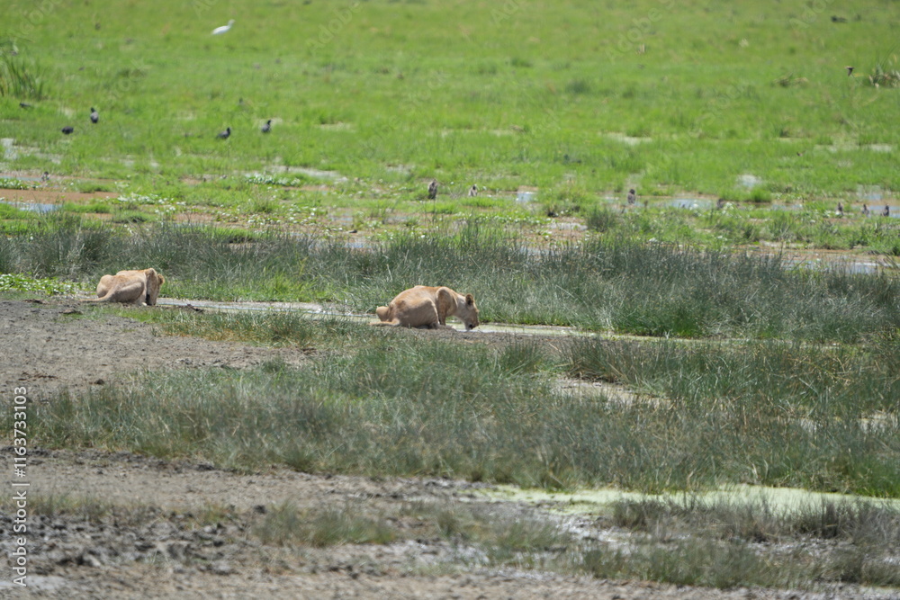 lioness (lions) drinking from a small water pool in the serengeti national park