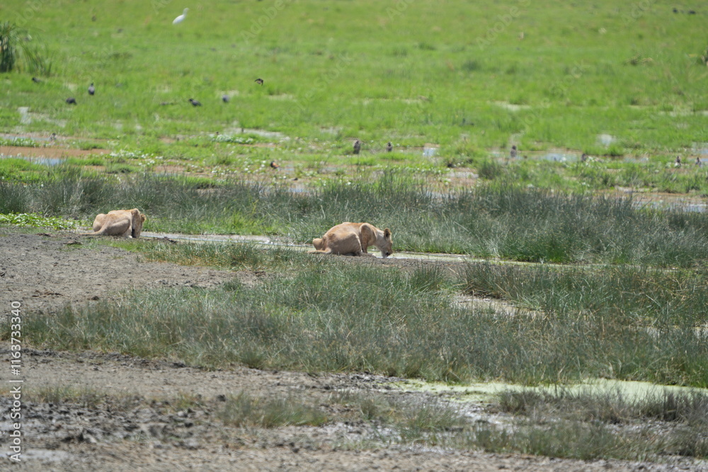 lioness (lions) drinking from a small water pool in the serengeti national park