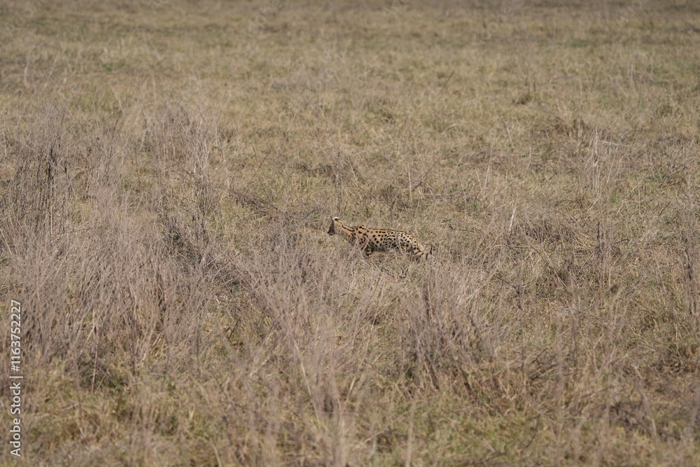 portrait of a serval cat in the serengeti national park, camouflaged serval cat, wildlife safari in tanzania