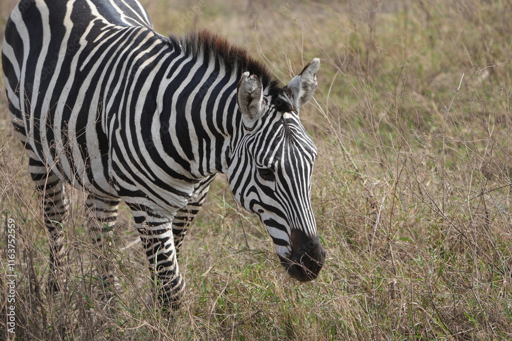 close up portrait of a zebra grazing in the Ngorongoro crater tanzania wildlife safari