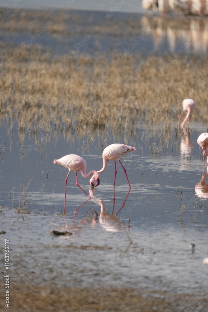 flamingos in the lake of the ngorongoro crater in tanzania, safari, wildlife