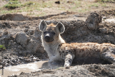 close up of a hyena laying in the mud in the Ngorongoro crater tanzania, hyena portrait, daylight