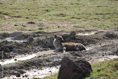 close up of a hyena laying in the mud in the Ngorongoro crater tanzania, hyena portrait, daylight