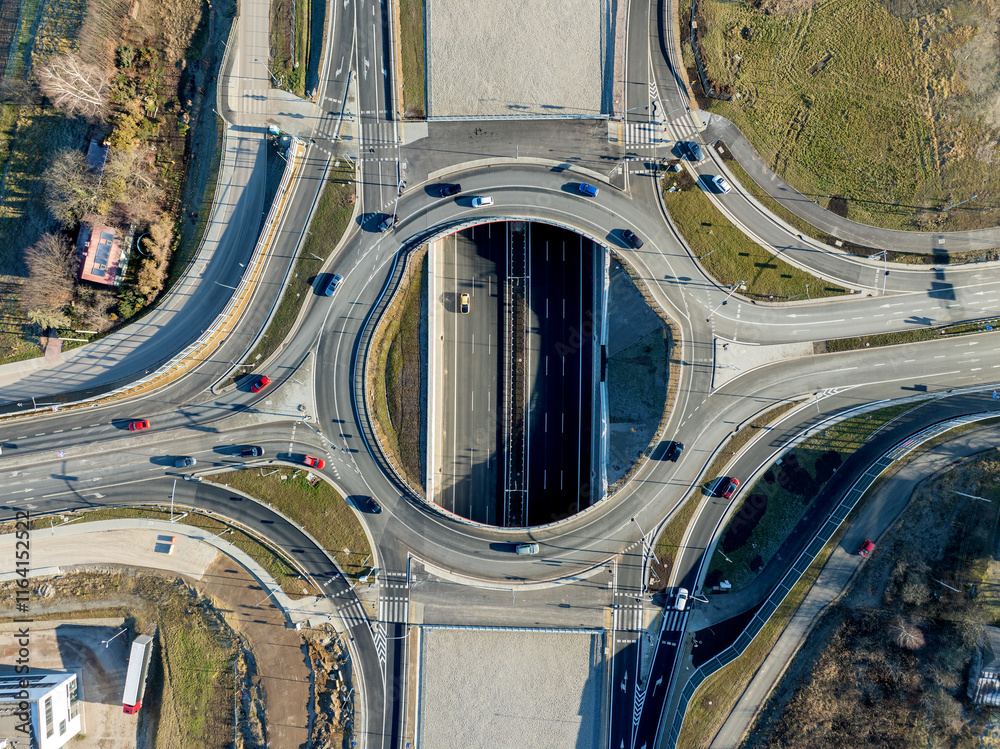 Krakow, Poland. Wegrzce interchange on new S52 highway (below) opened on December 23, 2024. Part of freeway around Cracow. Traffic circle with a hole inside and ramps. Aerial view from above at sunset