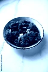 Blue Cauliflower in a sieve after blanching cotton towels on a blue background