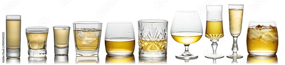 Glasses of alcoholic drinks isolated on white.