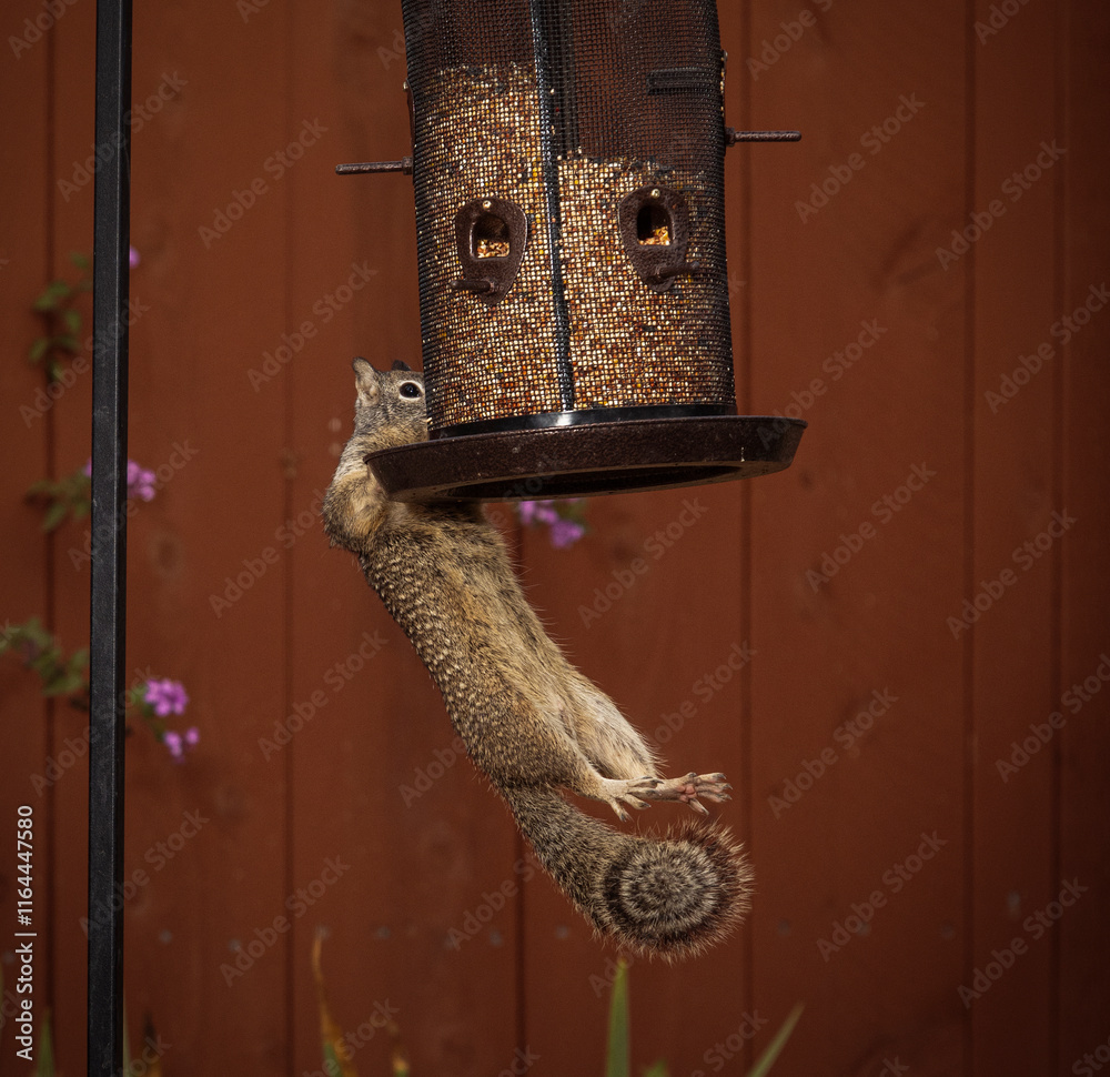 A Squirrel hanging on a bird feeder with its front paws