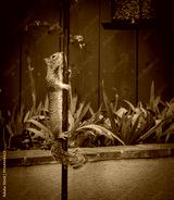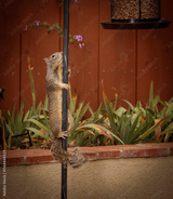A squirrel climbing the metal pole of a bird feeder