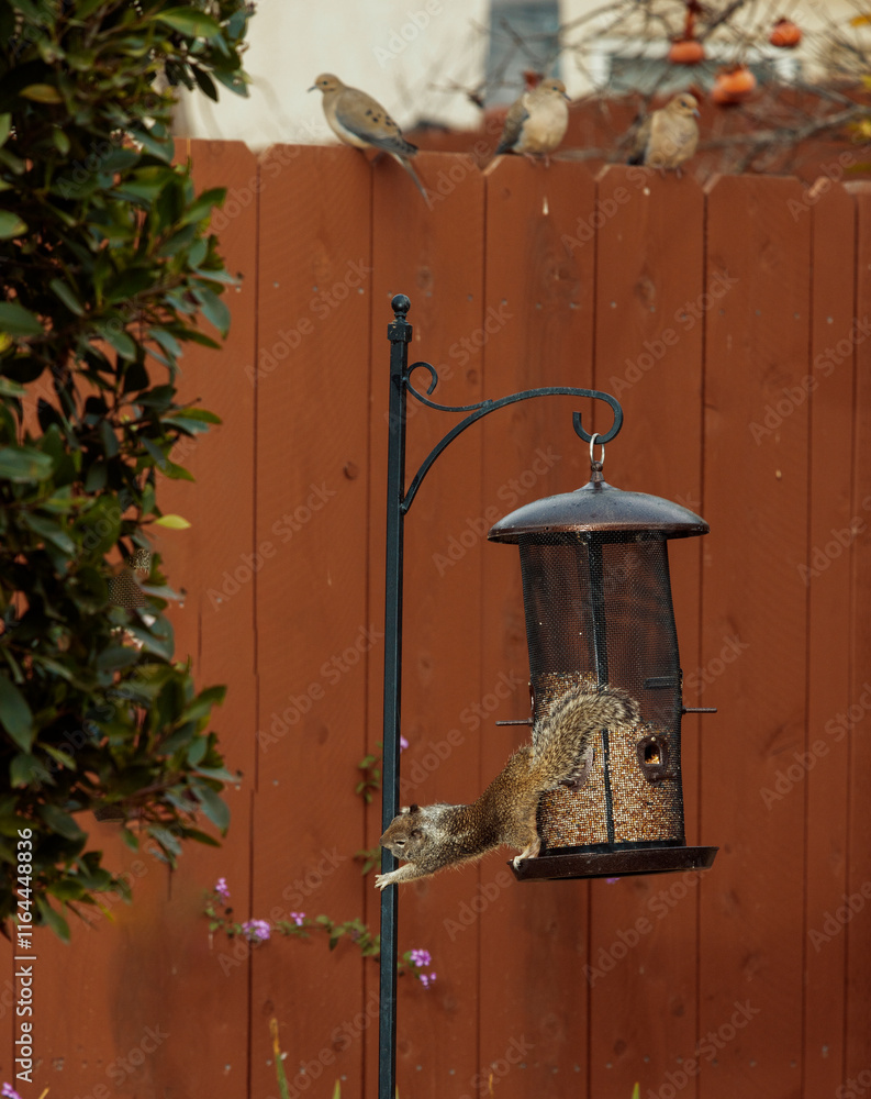 A squirrel climbing the metal pole of a bird feeder with birds perched on a fence