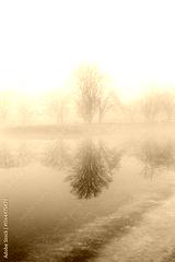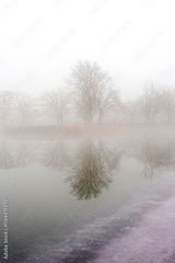 Foggy winter landscape with trees in the mist and snow-covered ice over the lake in New Haven, Connecticut, USA