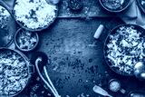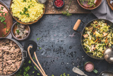Delicious dish with stewed chopped cabbage and mushrooms, yellow rice and mincemeat on dark background , top view. Rustic food cooking