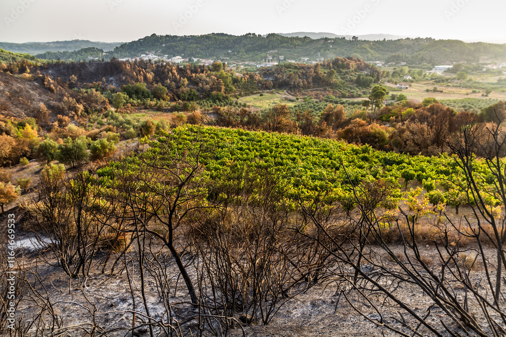 Burnt forest after a wildfire near Olympia on Peloponnese peninsula, Greece