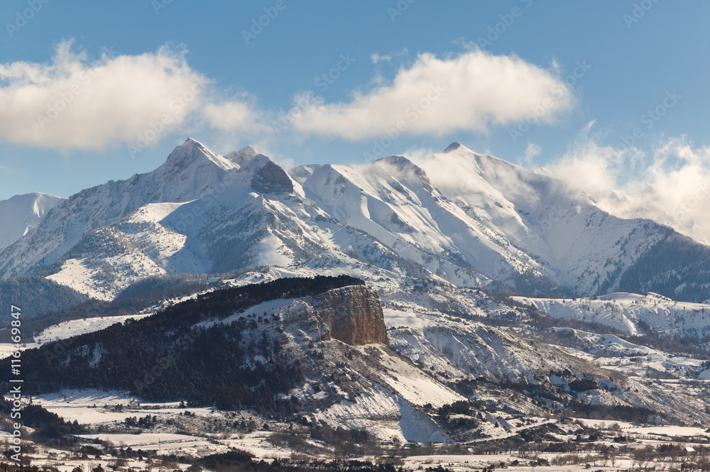 Chapeau de Napoleon with the Arche, Aiguille and Piolit peaks just after a snowfall. Winter morning view in Ecrins National Park in the Southern French Alps (Hautes Alpes) France