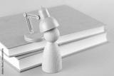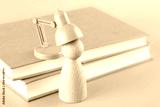 The wooden man is being charged by the book