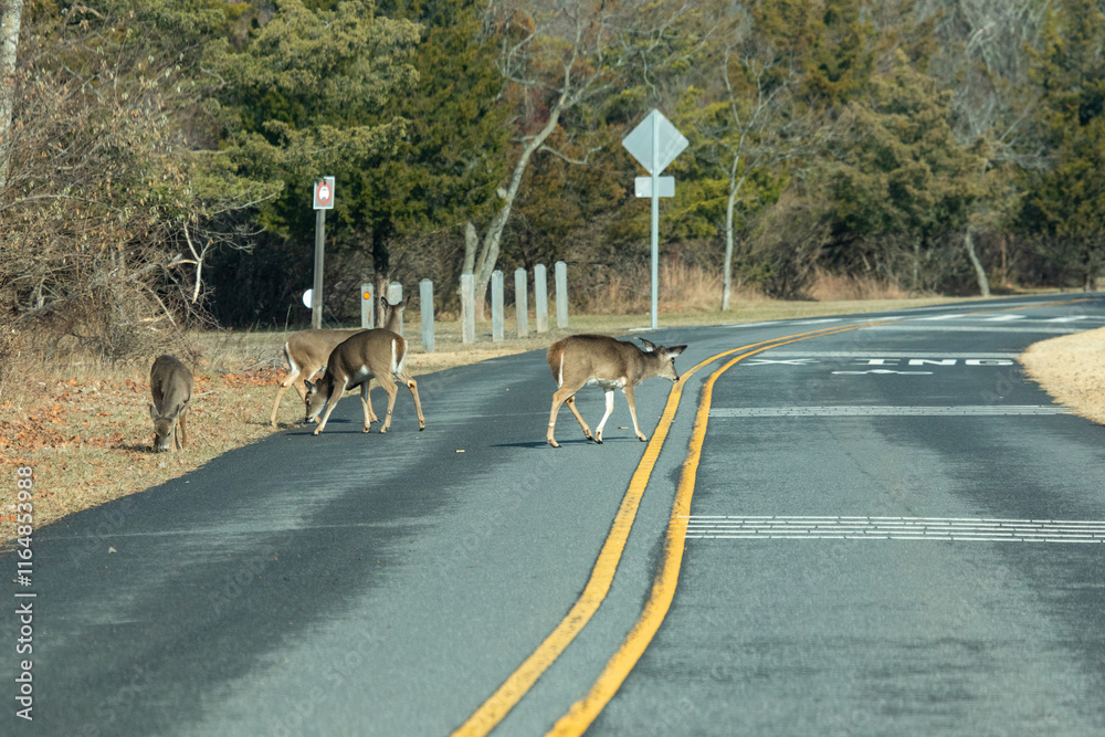 White-tailed Deer stand in the middle of the road, disregarding traffic after someone threw food out their car window. This is a problem in Sandy Hook, New Jersey.