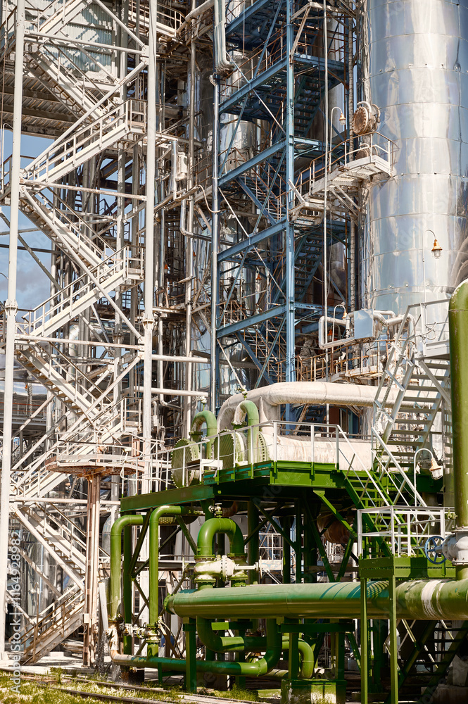 Chemical plant featuring a large distillation column with extensive metal structures and piping observed during daylight hours