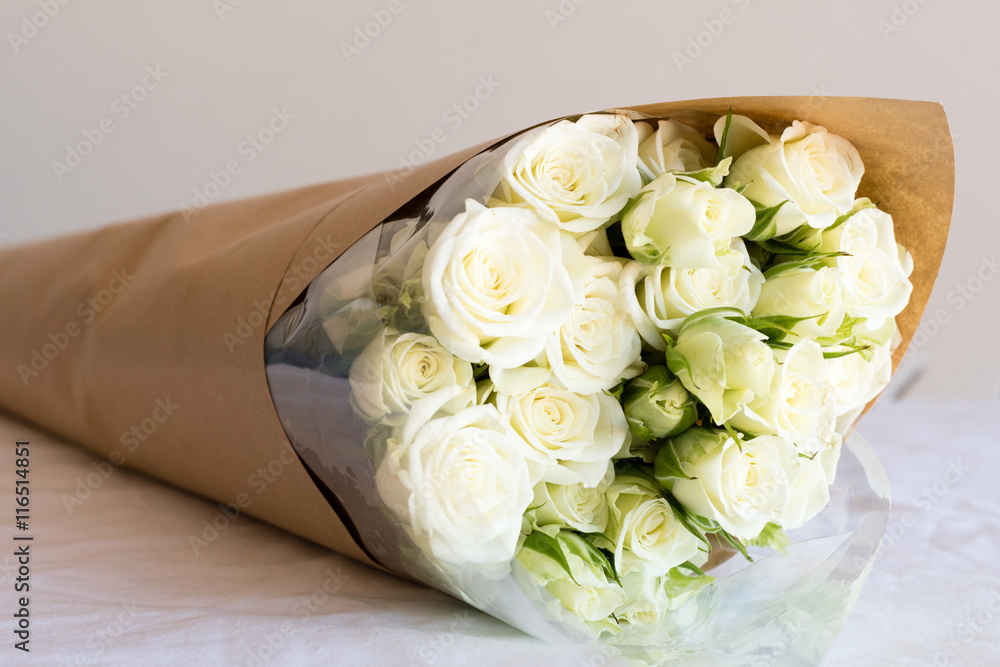 White spray roses wrapped in clear cellophane and brown paper and lying on white tablecloth