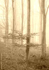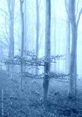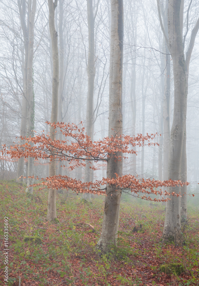 Deep foggy woodland in Deer Wood on the high weald near Dallington East Sussex south east England UK