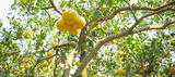 Large branch of mature grapefruit tree load of ripe pomelos under clear blue sky ready to harvest in Hanoi, hanging Dien citrus heirloom grapefruit fruits branch at homegrown backyard garden